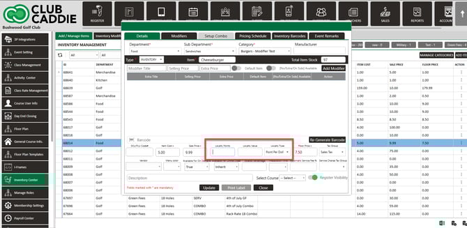 In the Edit Item window, set Loyalty Type and points (if Fixed), then click Update/Save.
