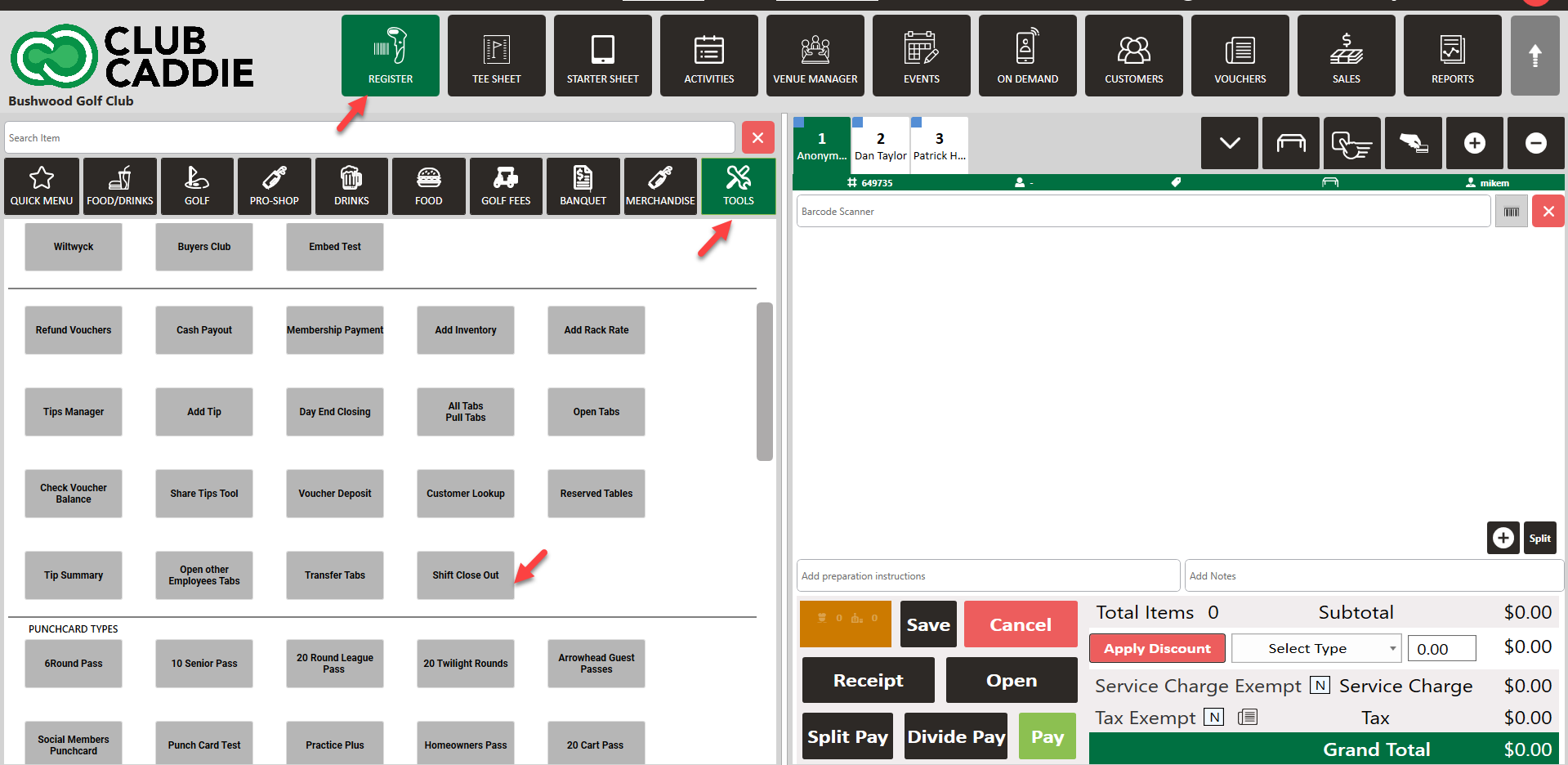 Click on the REGISTER module at the top of the screen. Then, click on the TOOLS tab, followed by Shift Close Out.