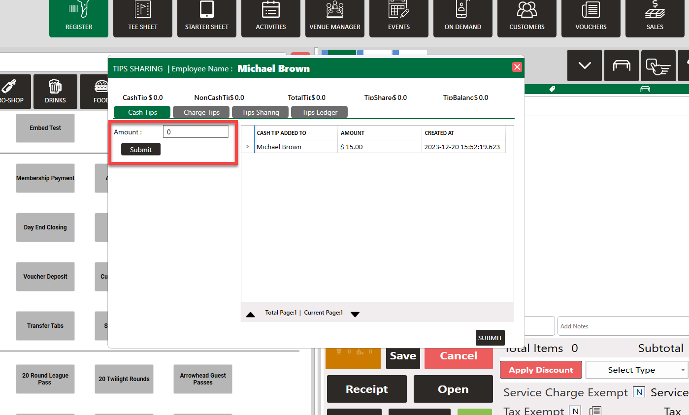 Step 2: A pop-up window will display where you will be able to enter the tip information for that employee. Once the correct amount is entered, click Submit.