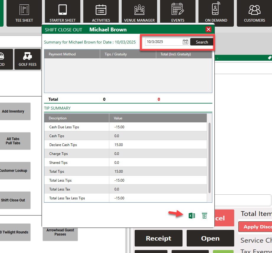 Step 3: Next you will see a breakdown in tips for that employee for the selected day. You can also use the calendar filter at the top if you wish to view another day. Lastly, you can export this report to excel or download a receipt by clicking on the icons in the bottom right corner.