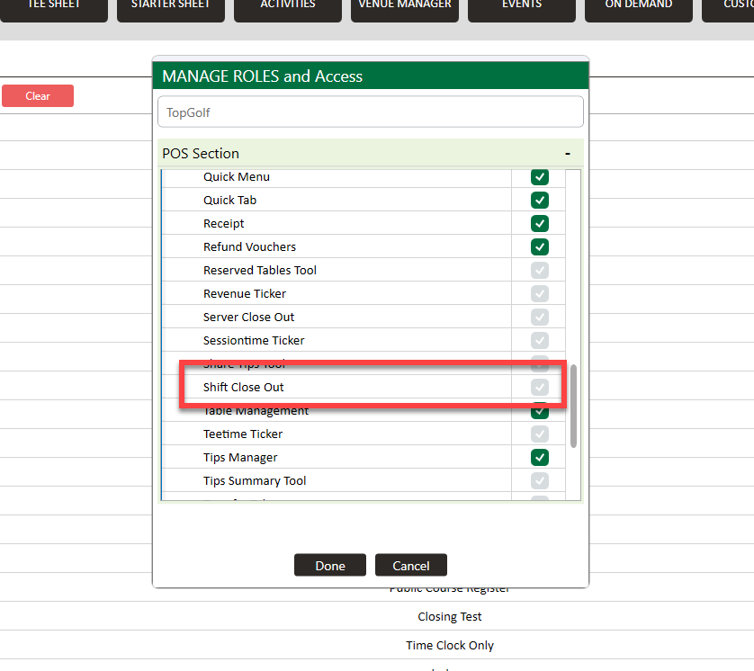 Step 3: Then, click on the Register drop down, and toggle on Shift Close Out. Click Done.