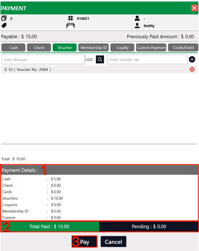 Step 4: The Payment Details section (1) shows the amount of balance split for each payment type. The system will update the Total Paid and Pending totals (2). Once the pending amount shows $0.00 and the split is correct, click on Pay (3) and the system will complete the transaction.