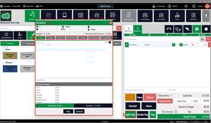 Step 2: Click on the Split Pay Button. The system will open a PAYMENT window (2). You can click different modes of payment: Cash, Check, Voucher, Membership ID, and Credit/Debit (3).