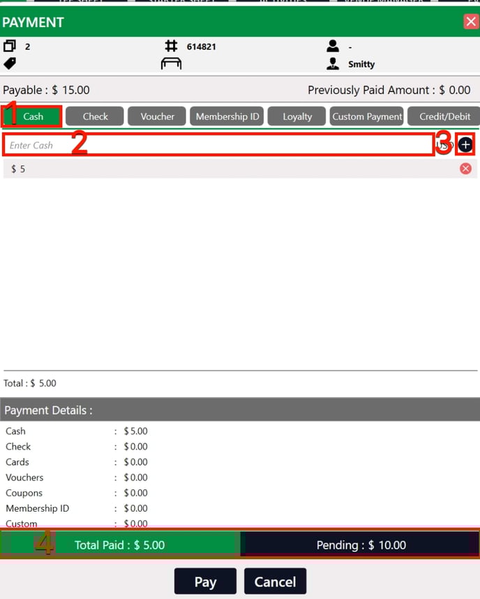 For example: select the option Cash (1) and fill the Enter Cash (2) field with the cash amount and click on the "+" button (3). The system will update the Total Paid and Pending totals (4).
