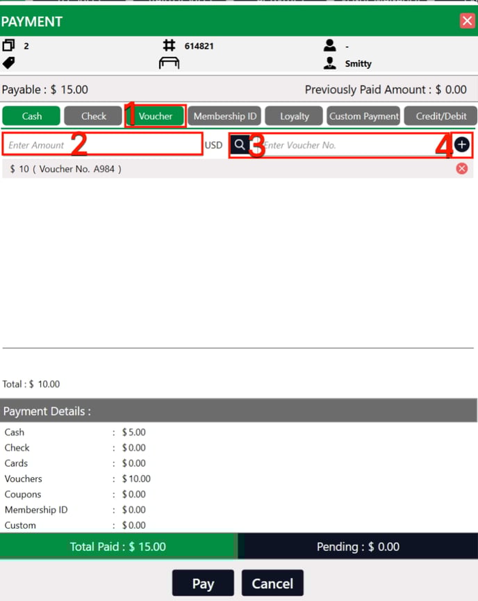 Step 3: Select another payment method to address the remaining pending balance. For example: Select the Voucher payment method (1) to pay the remaining balance using a voucher. Fill in the Enter Amount field (2) with the voucher amount, search for or use the Enter Voucher No. field (3) to locate the voucher and click on the "+" button (4) to confirm the payment amount.