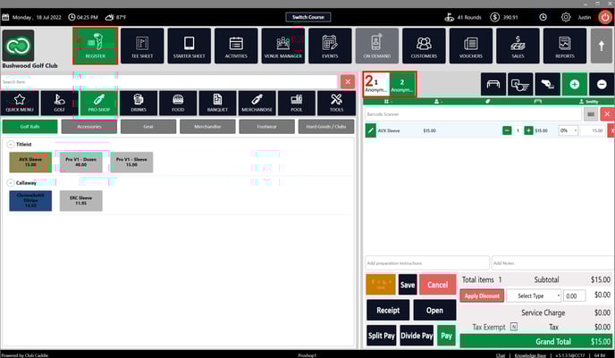 Step 1: From the REGISTER module (1), select a register tab to process a payment (2).