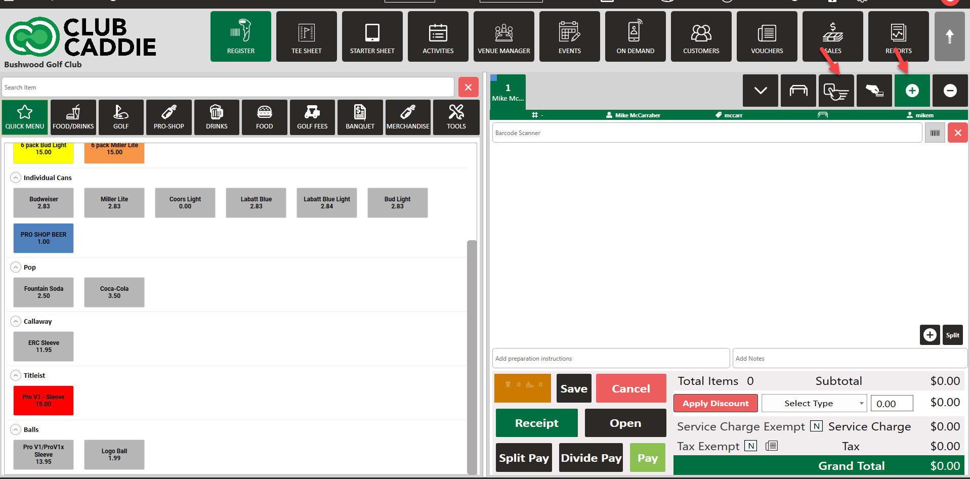 Step 2: Create a new tab by either using the "+" button, quick tab button, or table management button. If no customer is selected during that process the system will create a new anonymous tab in the cart section of the register.