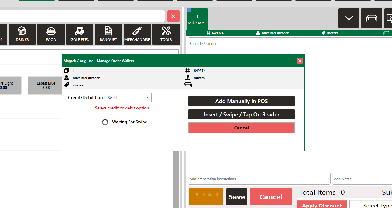 Step 4: The system will open a Manage Order Wallets pop-up window, where card details can be added after selecting debit or credit. When you are finished select the Ok button at the bottom of the window.