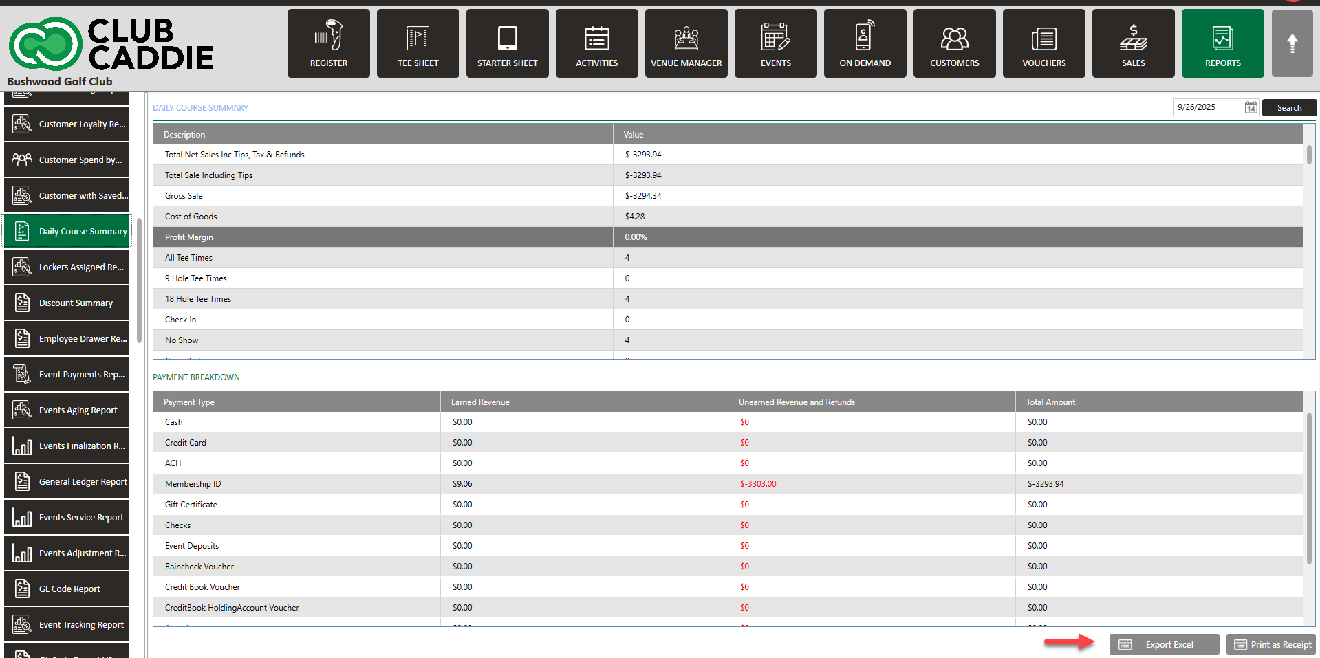 Step 3: To export the data to an excel sheet, click on the Export Excel button. Click on the Print button to print the summary through a select printer. Click on the Print as Receipt button to view a report as a receipt.