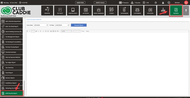 Step 1: Select Reports from the module navigation menu at the top. Then, on the left hand of the screen, select the GHIN Rounds Report.