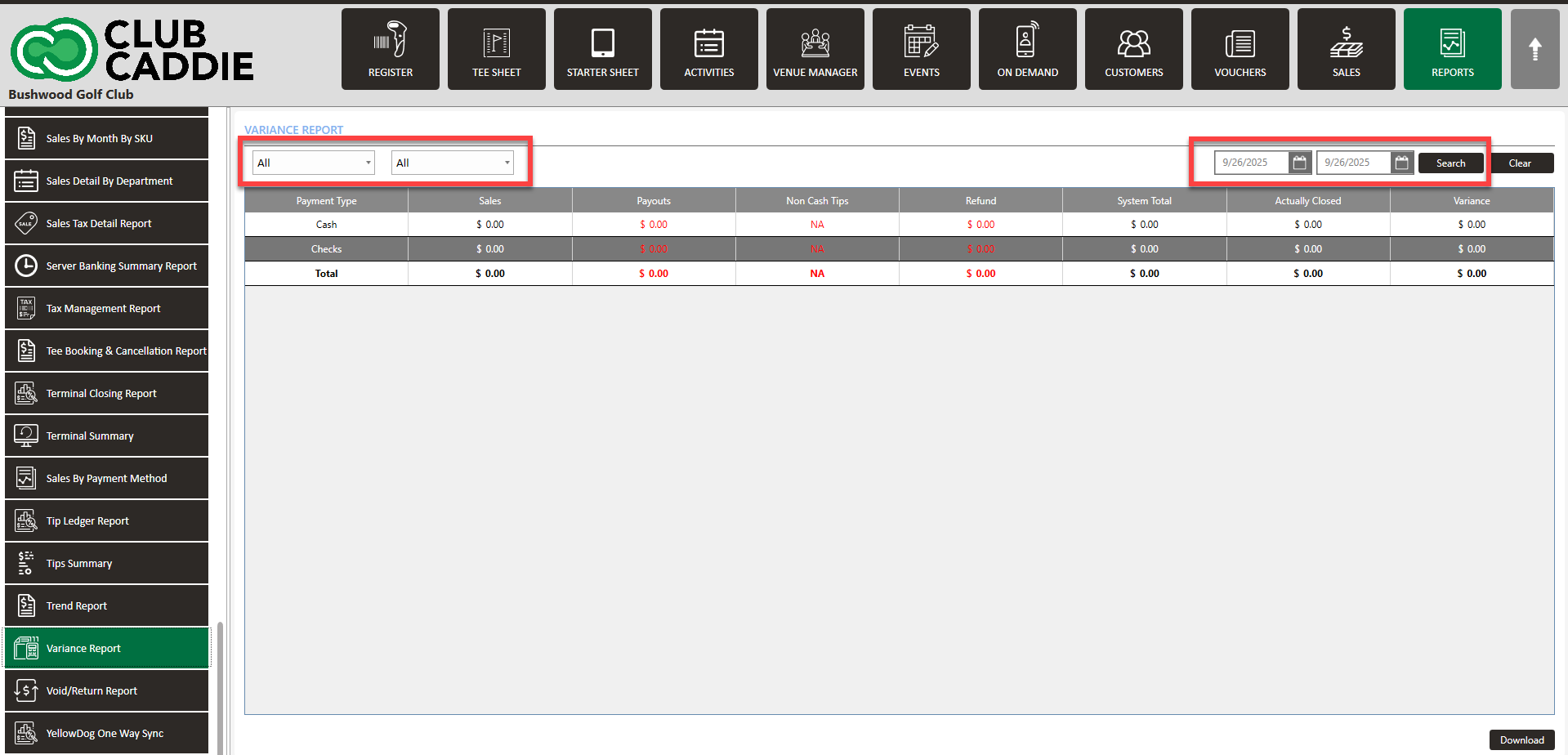 Step 2: The variance report is based on each particular terminal report. Once you are on the variance report window you can select from the drop-downs with department and sub-departments, you can also choose from a particular date from the calendar drop-down menu. The system will choose the current date by default.