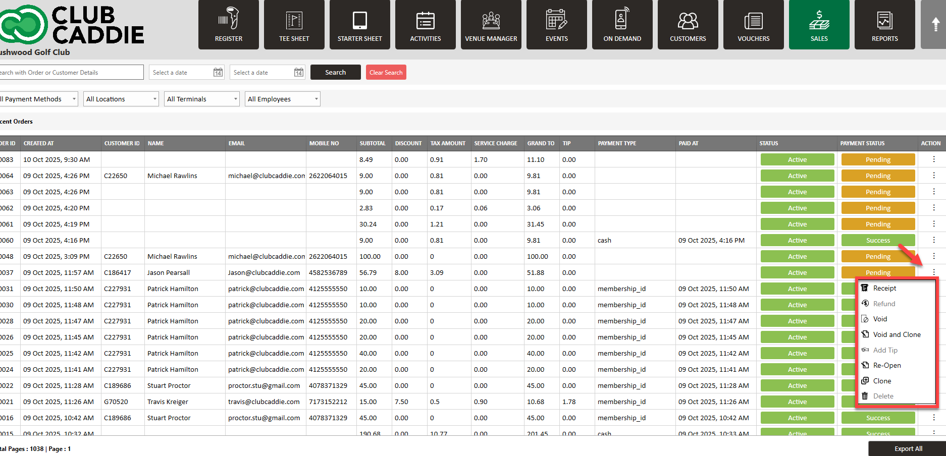 Step 2: Locate the order with a payment status of "Pending" or "Success." Click on the Action button on the right side of the desired order. The system will generate a pop-up menu with options such as Receipt, Refund, Void, Void and Re-Open, Add Tip, Re-Open, and Clone. Select the "Re-Open" option from the drop-down list for orders with a "Pending" payment status.