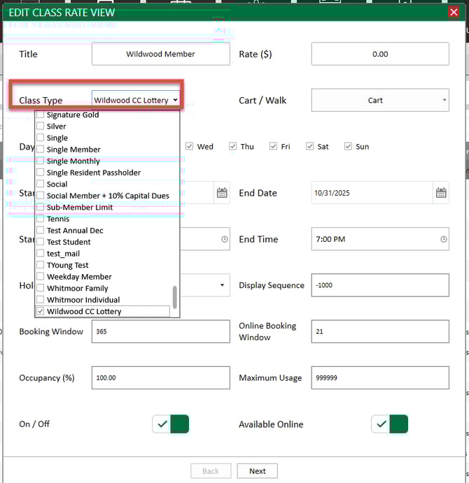 Step 4: You can apply any classes that you would like to have this rate available for by clicking the dropdown Class Type, and checking the box for the class.
