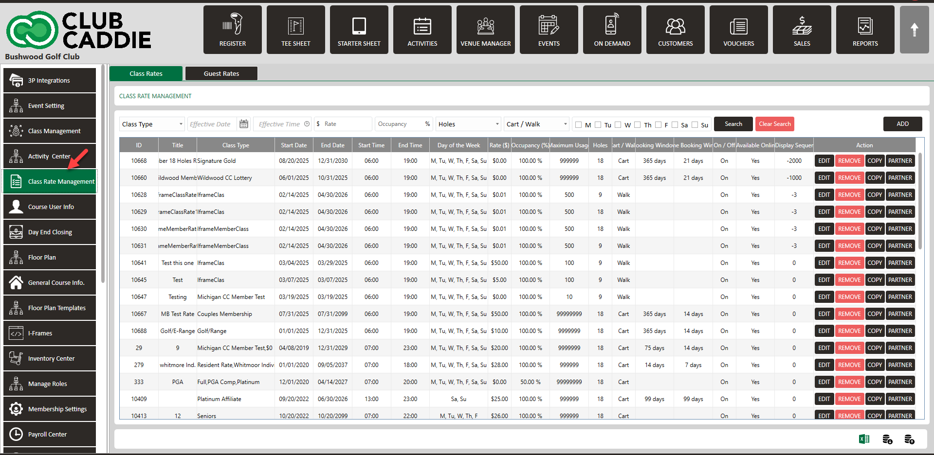 Step 2: Click on the “Class Rate Management” Button from the row on the left side of the screen. You will get a "Class Rate Management" window.