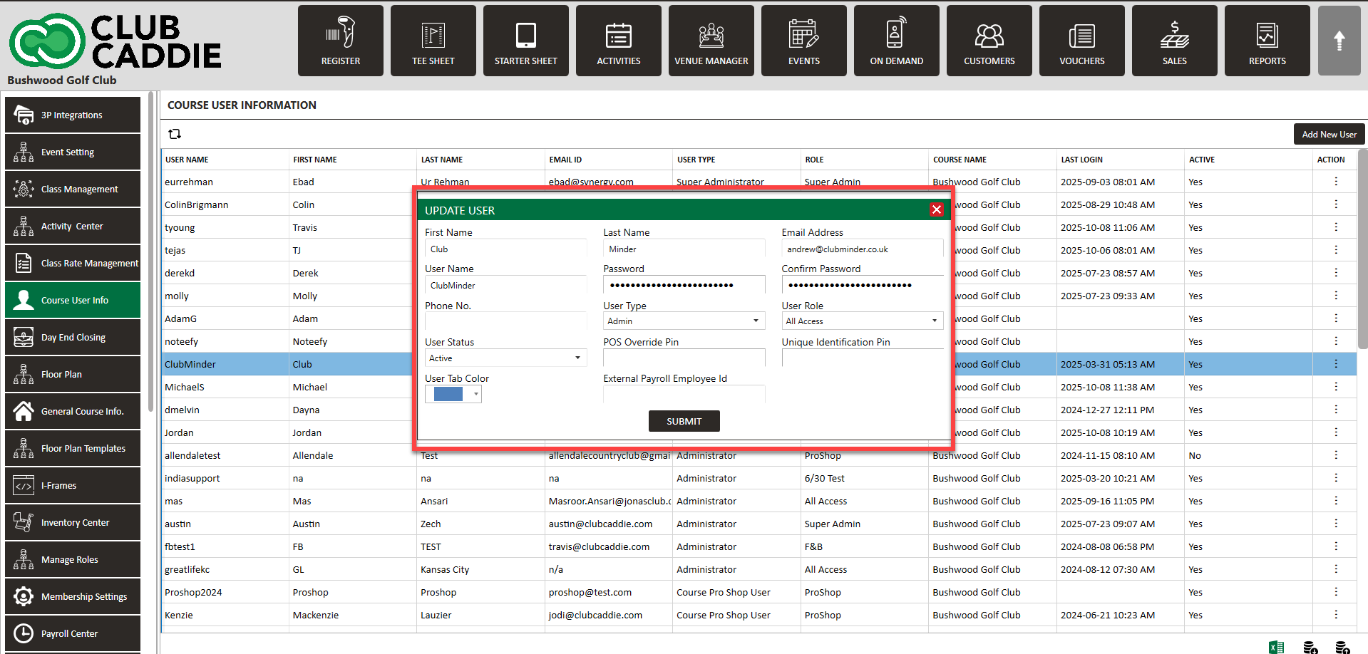 Step 4: Edit User Info – Double click on the User you wish to edit. The system will open a pop-up named UPDATE USER where user information can be updated. For example: To change a user's phone number, input the new telephone number and click on the SUBMIT button. Once SUBMIT is clicked, the system will update the user information.