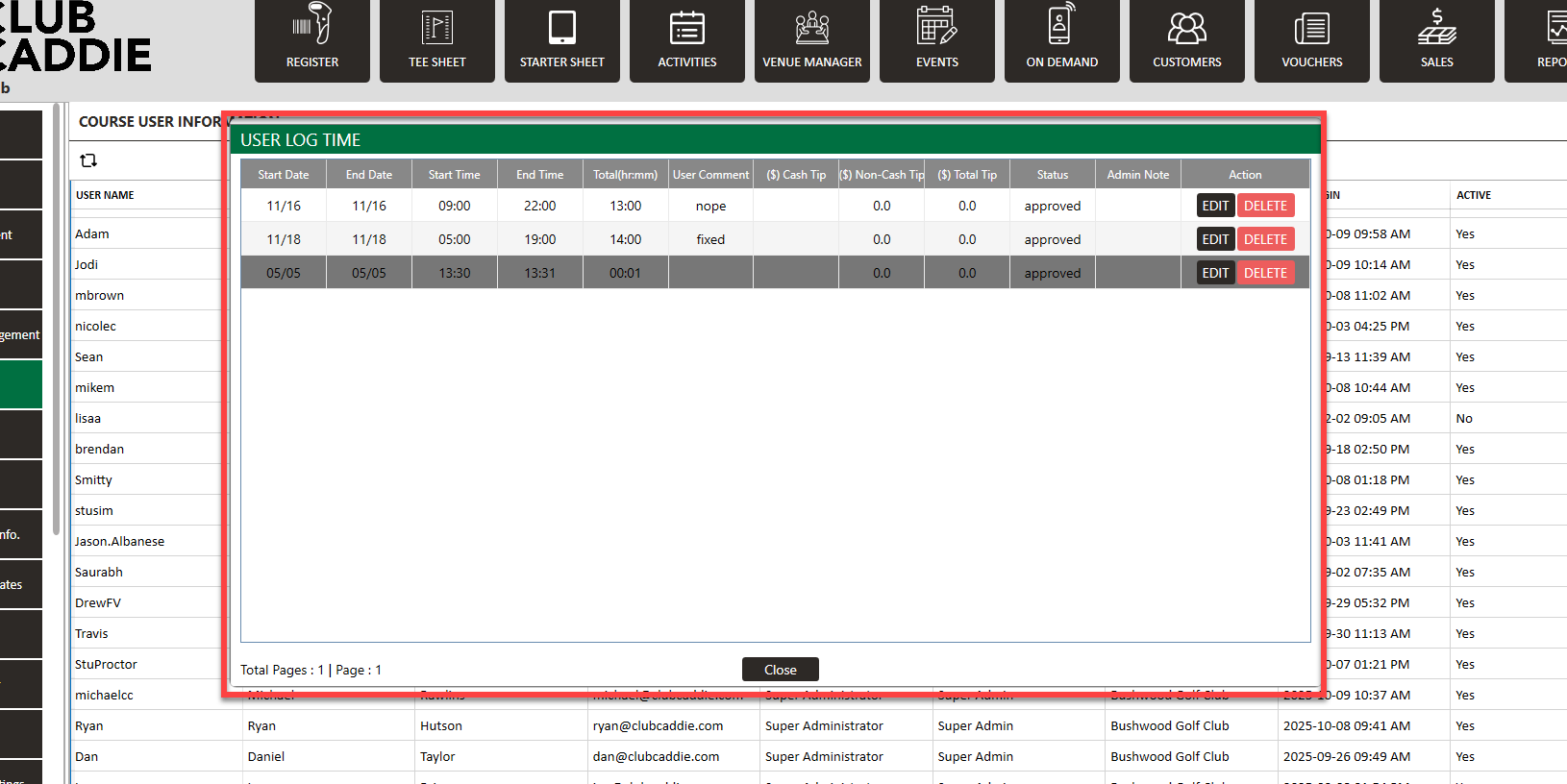 Step 7: Log Time - Select a user and click the Log Time button. The system will open a USER LOG TIME window where login information regarding that particular user like Start Date, End Date, Start Time, End Time, and Total (hr: mm) can be viewed.
