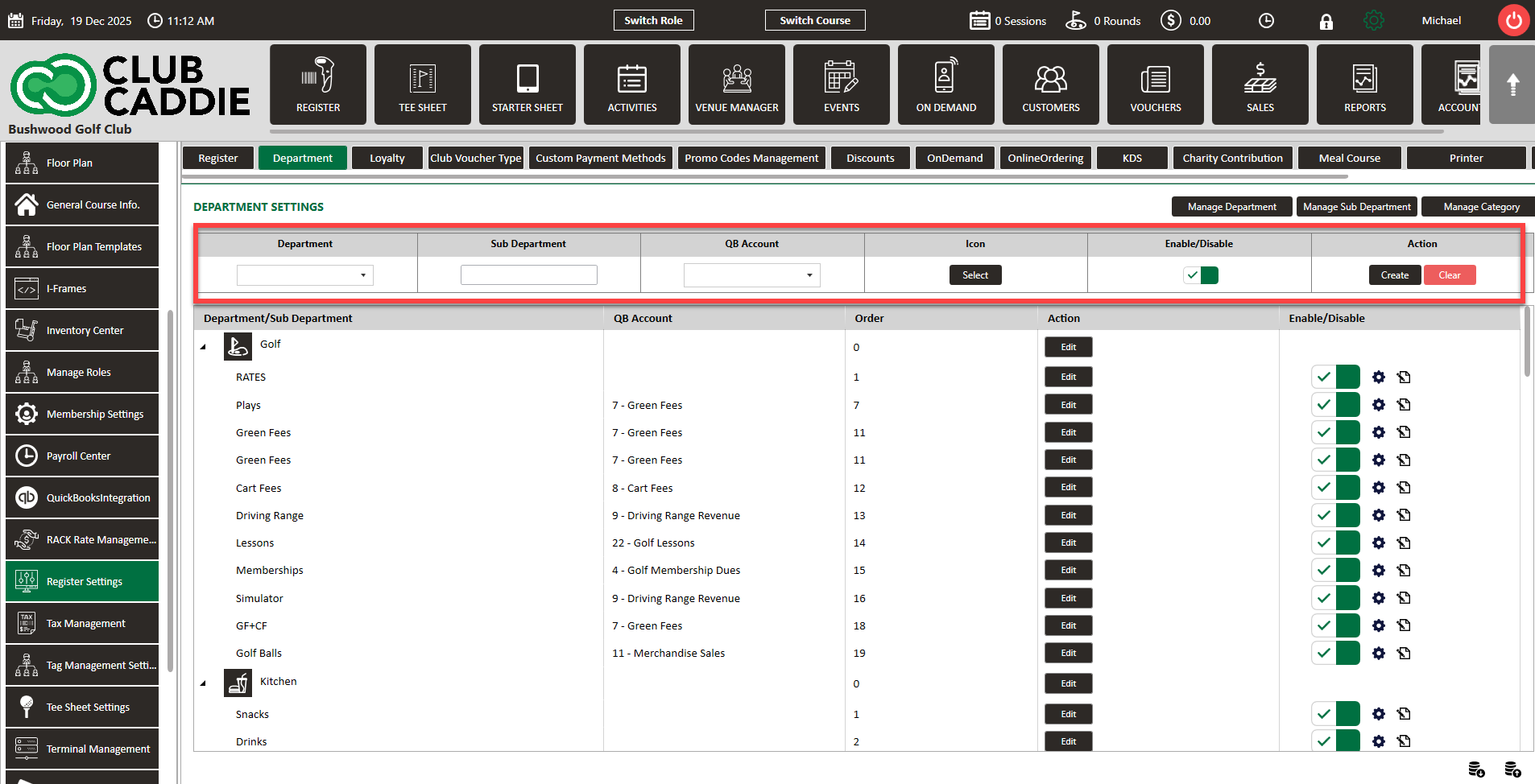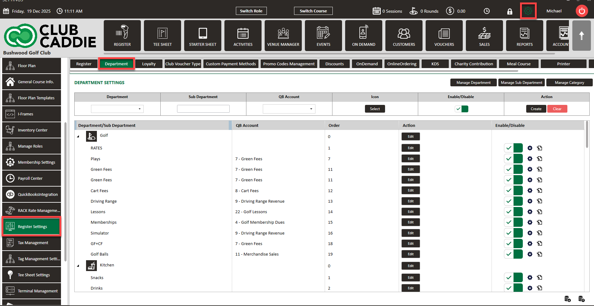 Step 1: Click on the Settings icon on the top right corner of the screen. Then click on Register Settings in the left-hand menu and then click on the Department tab.