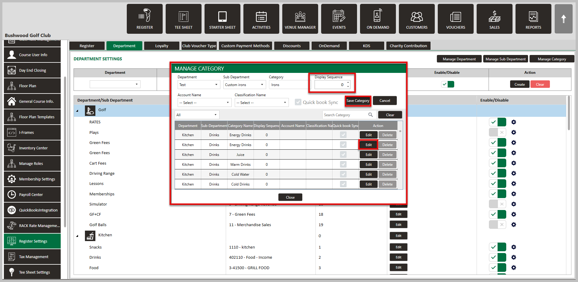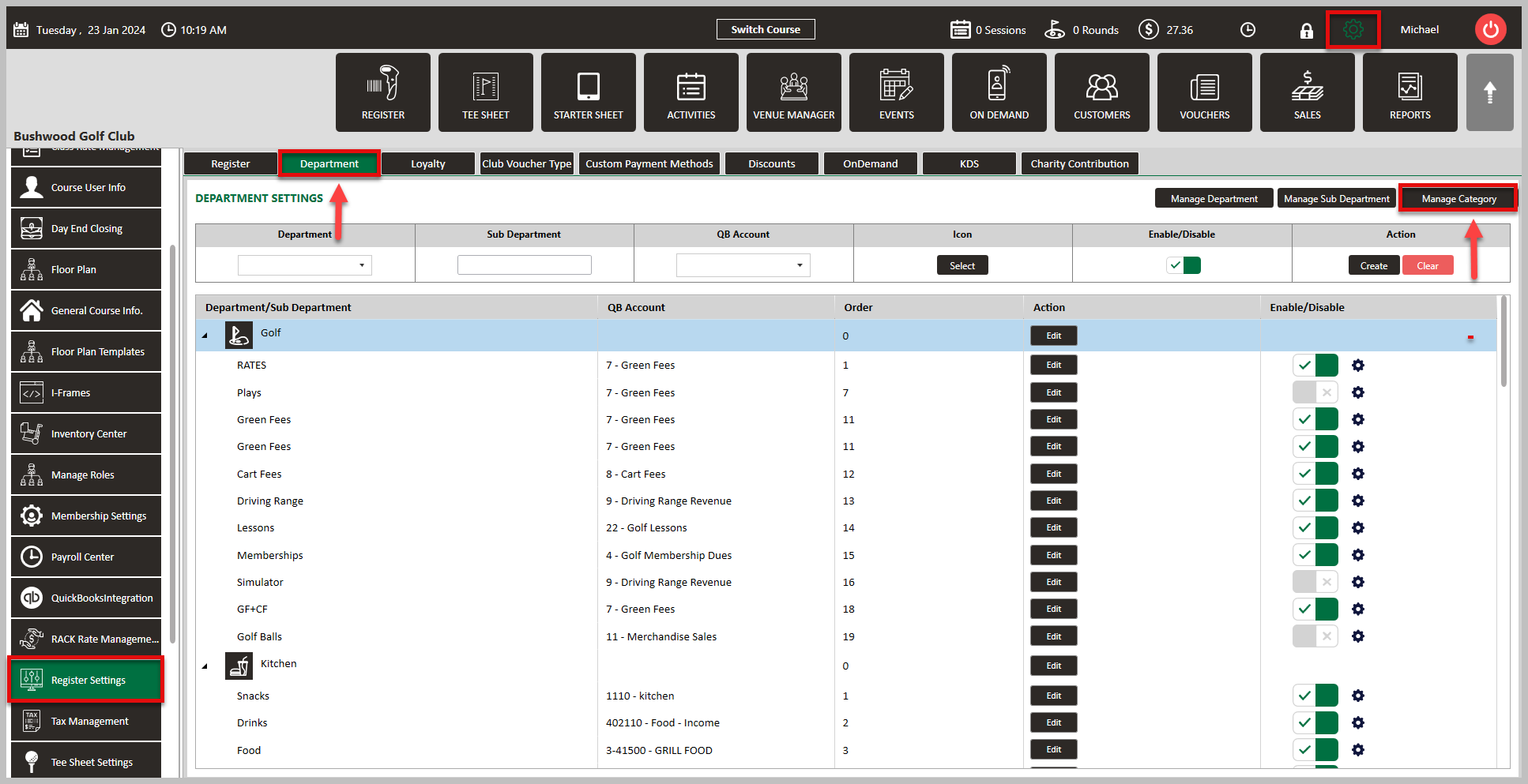 Step 2: Click on the Department tab along the top row, followed by Manage Category over on the right hand side. This will generate a Manage Category pop-up window.