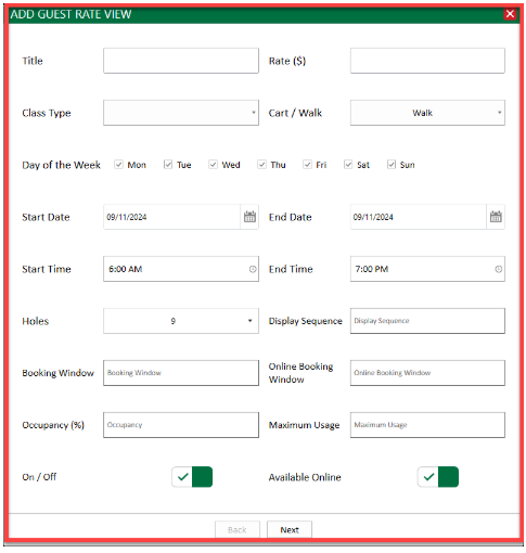 Step 2: Select the Guest Rates tab, then click on Add. Here in the pop-up window, enter the correct information for the guest rate. When all the information is entered, click Next.