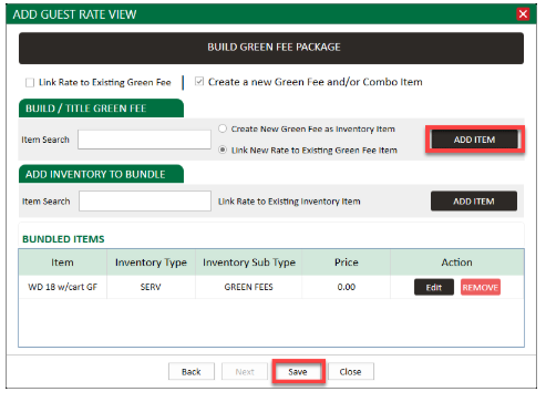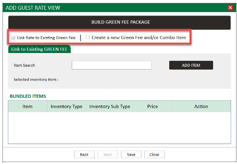 Create New Green Fee as Inventory Item or Link New Rate to Existing Green Fee Item (most common). With either choice you are creating a new combo in your inventory, but you have the option to either tie the greens fee part of the combo to another greens fee or create an entire new greens fee.