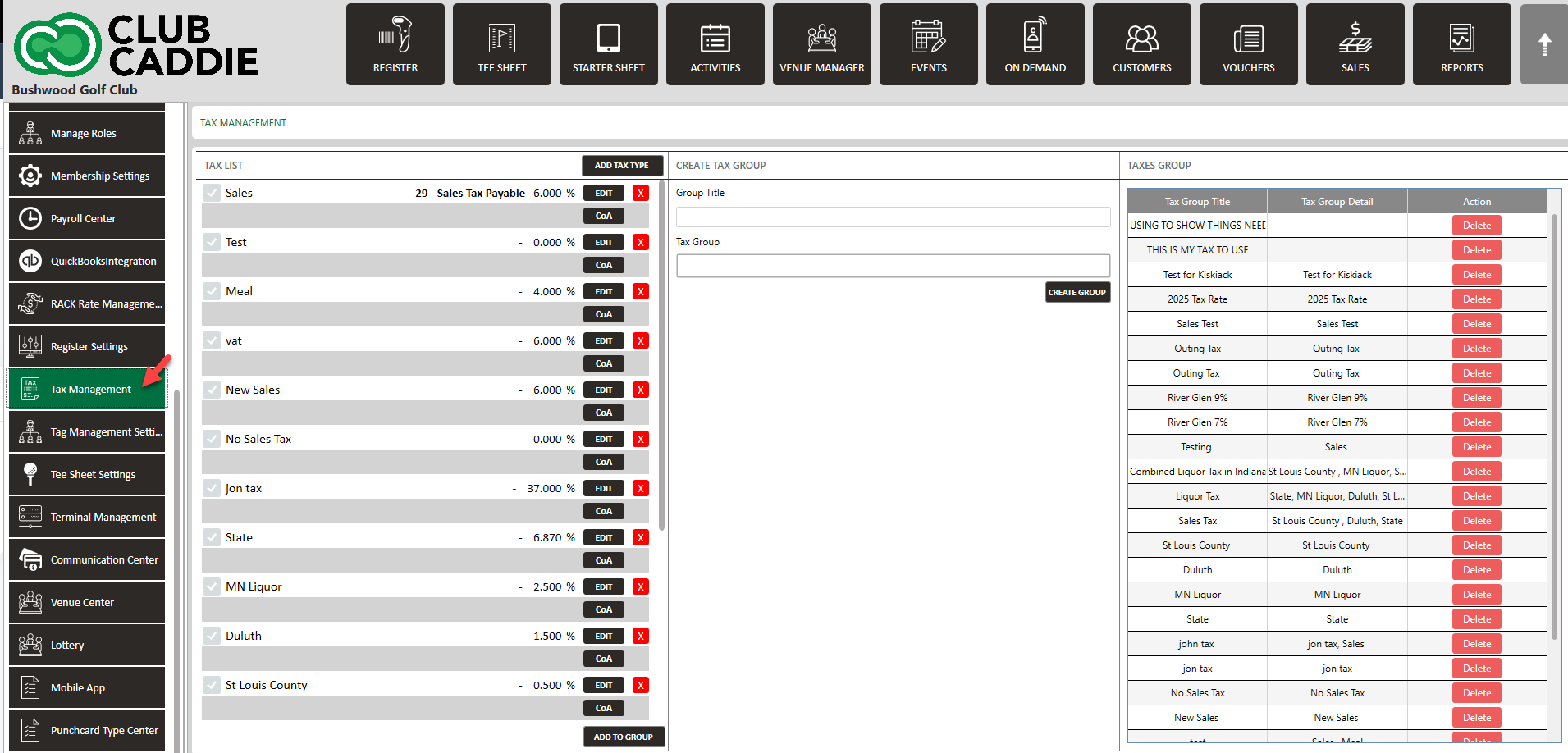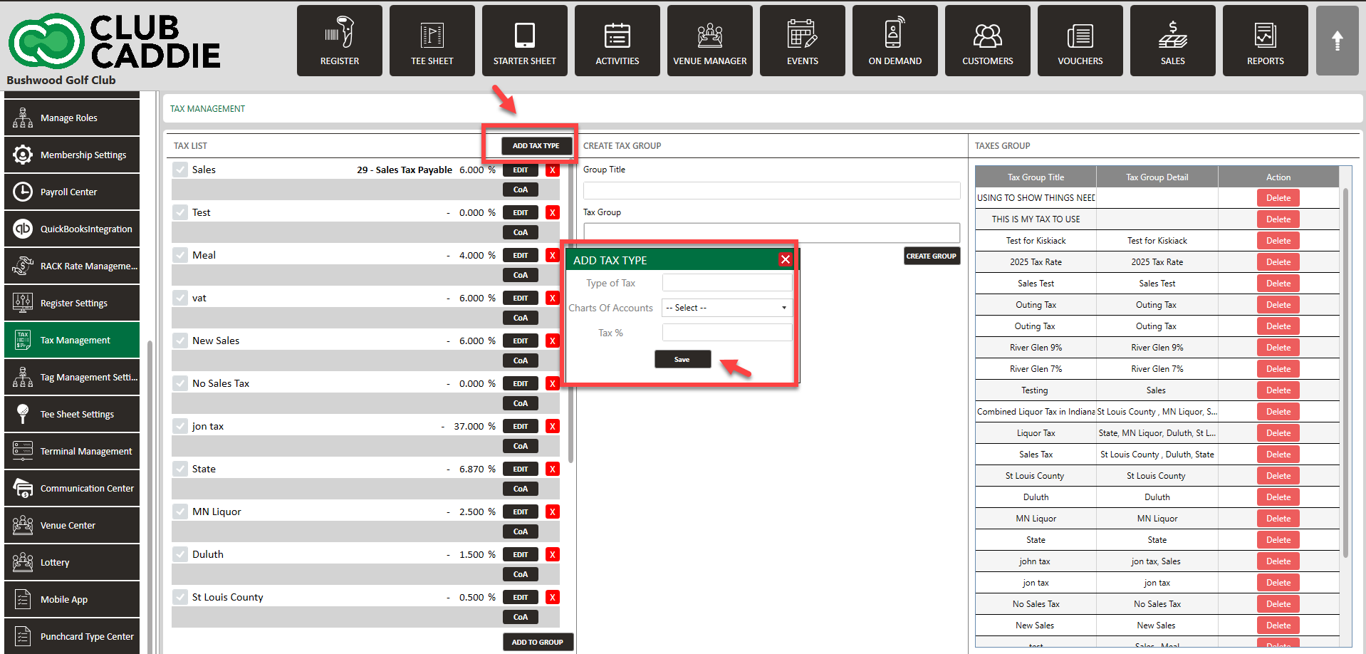 Step 3: Click on Add Tax Type. In the pop-up, fill in the name of the new tax, chart of accounts, and enter in rate % (enter as # and omit the % symbol). Click Save.