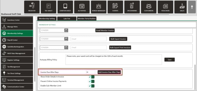 Step 2: Scroll down until you see the option to set the Invoice Due After Days setting. Enter the number of days for the invoice due date. This number is capped at 30 days.
