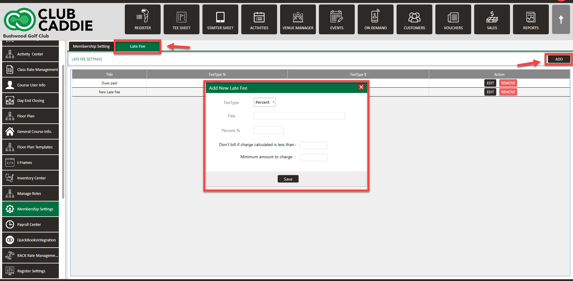While still under Membership Settings, click on the Late Fee tab. Then, click Add to create a late fee. Fill out the required fields.
