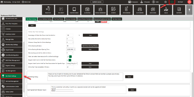 Step 1: Navigate to Settings by clicking on the Gear Wheel in the top right corner. Then, select Tee Sheet Settings from the left-hand side menu.