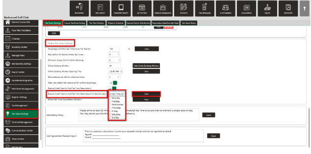 Step 2: Select the Tee Sheet Settings tab along the top row. Then, navigate down to the section Online Tee Time Settings. Here you will see the option of Require credit card to hold tee time reservations for specific days. Click the drop-down, select the days, then click Save.