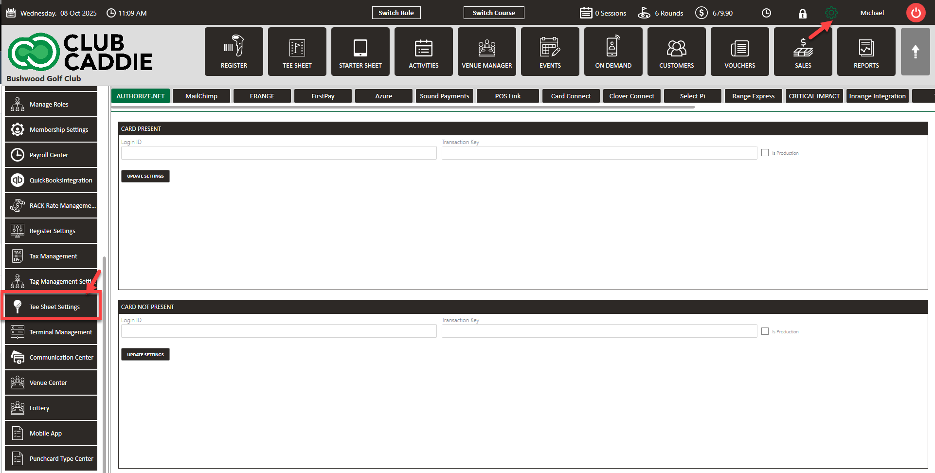 Step 1: Select Settings (gear wheel in top right corner), and then click on Tee Sheet Settings on the left hand side menu.