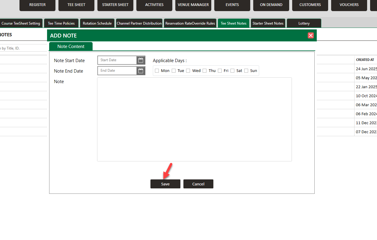 Step 2: Click on the tab Tee Sheet Notes. Then, click Add Note.