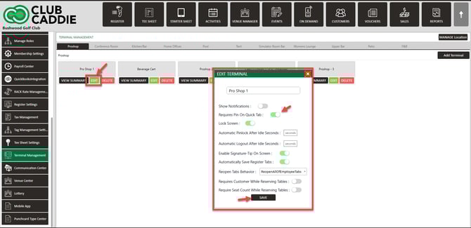 Step 2: Then, click on Edit on the terminal that you want this feature enabled. Then Toggle on Requires Pin on Quick Tab, then click Save.