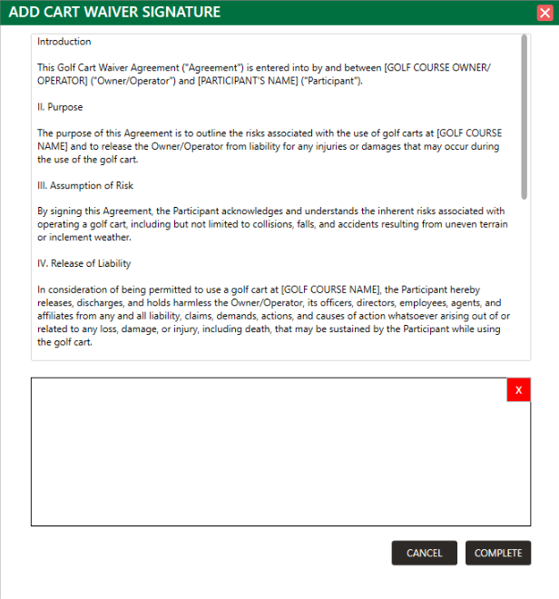 This allows golfers to sign a digital cart waiver when a cart number is entered for a tee time on the Starter Sheet. The system also includes a Cart Agreement Report that displays all signed waivers.