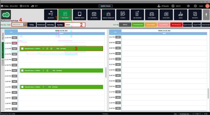 Step 3: Fill in the player name you want to check the Tee Sheet for on the current date (2). Once you fill in the name, the tee sheet will show the Reservation Time Slot for that particular player (3).