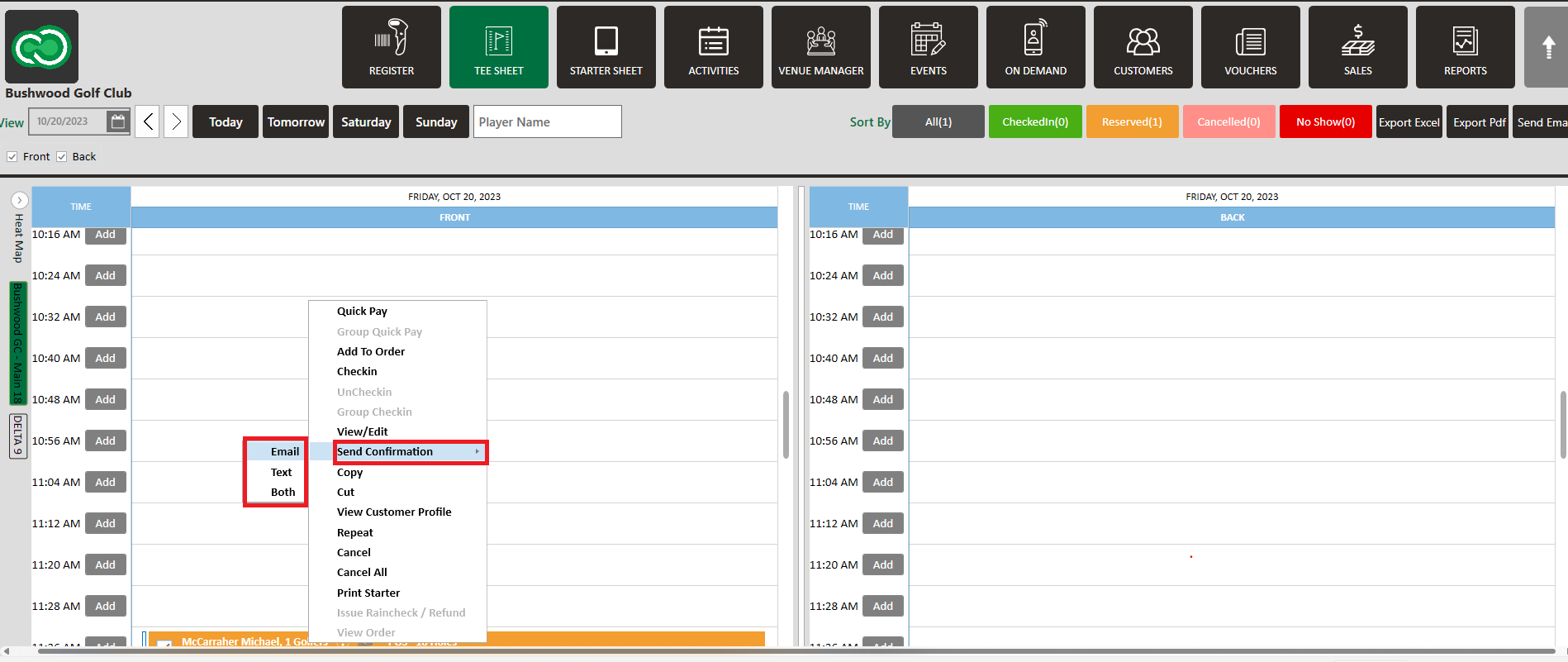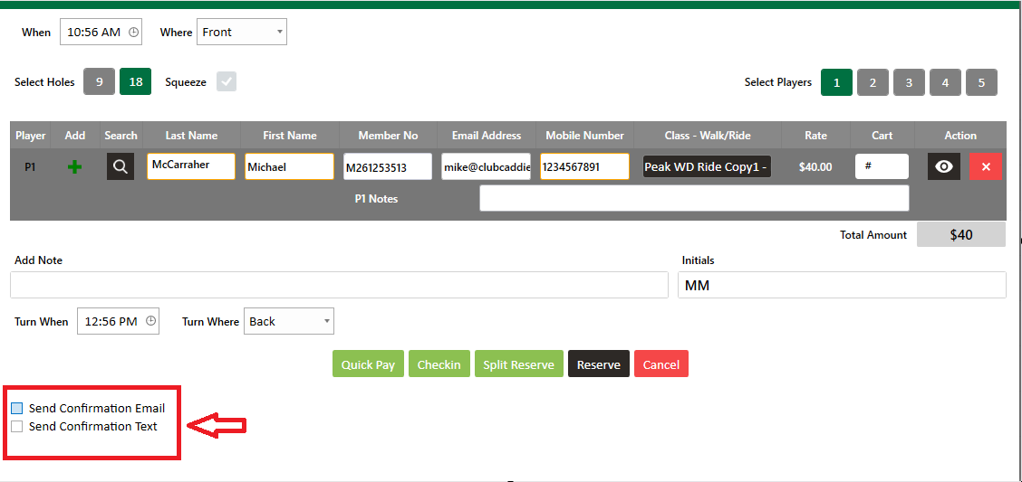 Step 3: Once you have entered the information for the tee time, there are two options on the bottom of the window - "Send Confirmation Email" and "Send Confirmation Text". You may select both options, one option, or if you don't want a notification to be sent, leave both boxes blank. Once you click "Reserve" or "Split Reserve", the tee time will be booked and the confirmation will be sent.