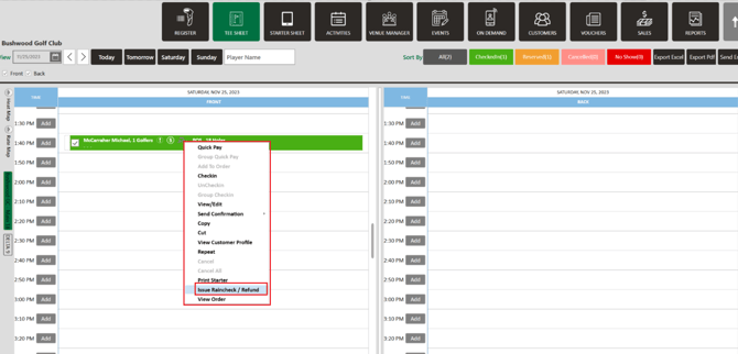 Step 2: Right-click on the desired tee-time and from the drop-down list select, Issue Rain check / Refund. This will open the order details window.