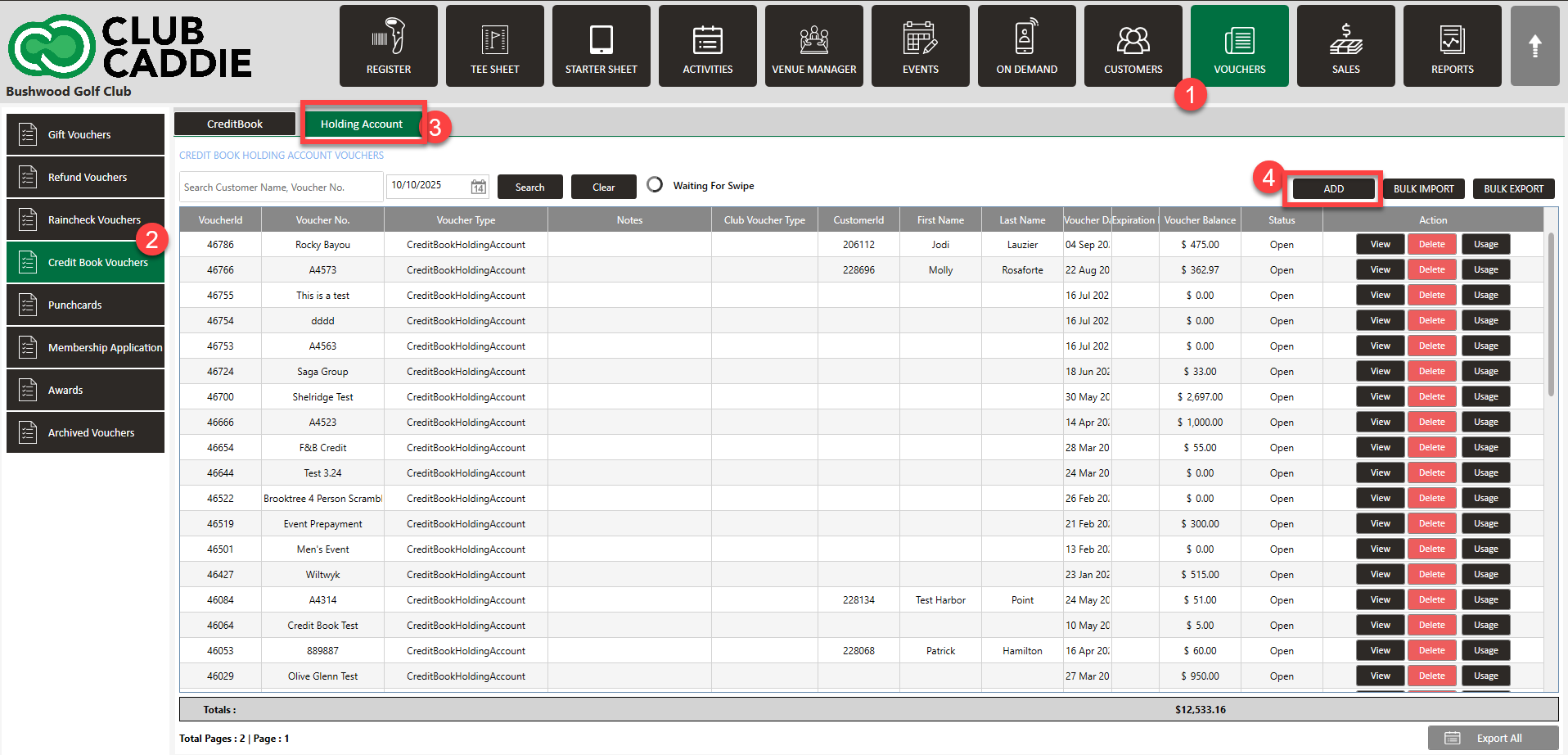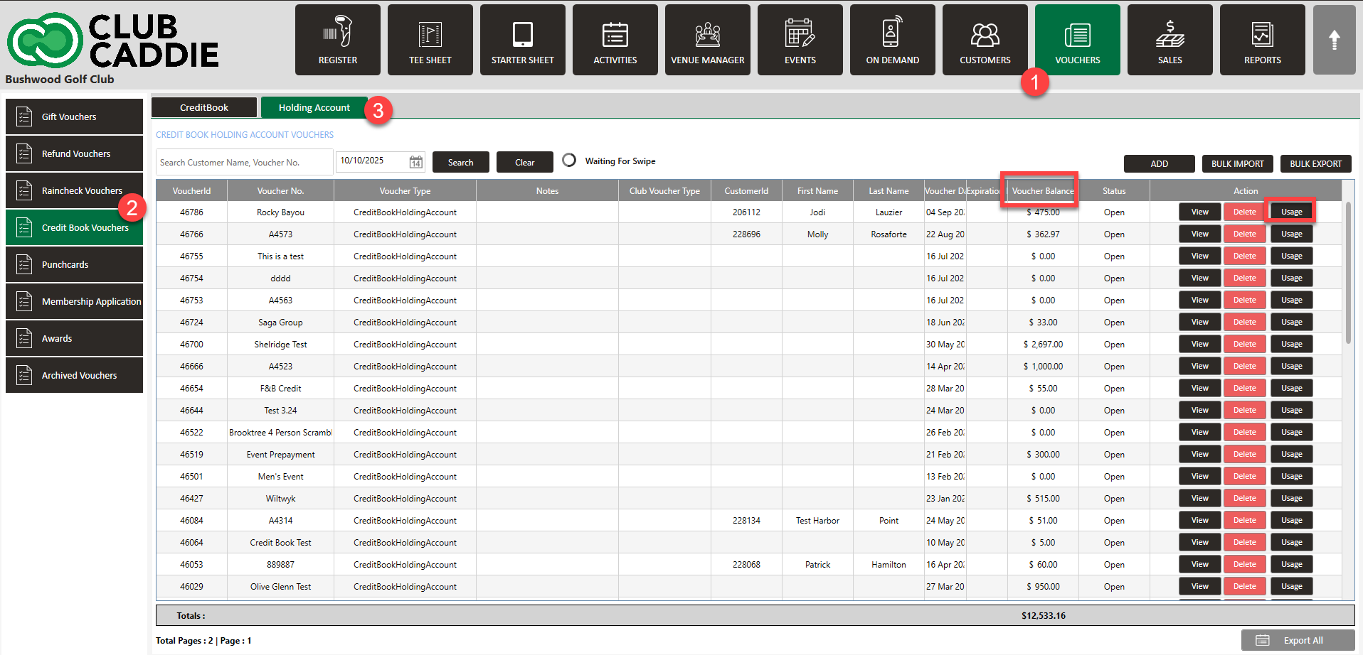 Step 5: To check the balance, usage history, or make additional edits to our newly created holding account we can navigate to the "Voucher Manager" module found in the top navigation bar. Next, select "Credit Book Vouchers" on the left-hand side and "Holding Account" in the top navigation bar.