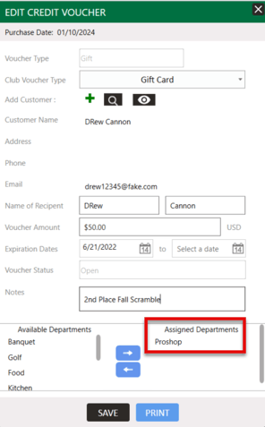 This feature is typically used by facilities that want to restrict where a customer is able to redeem their Voucher. Ex. Player A receives a $50 credit Voucher for 2nd place in the Fall Scramble Golf Event. The facility decided that the $50 credit that Player A won, should only be used in the Proshop, and not in any other department such for food or drinks. In this case, the only Department that would be moved over to Assigned Departments would be Proshop.