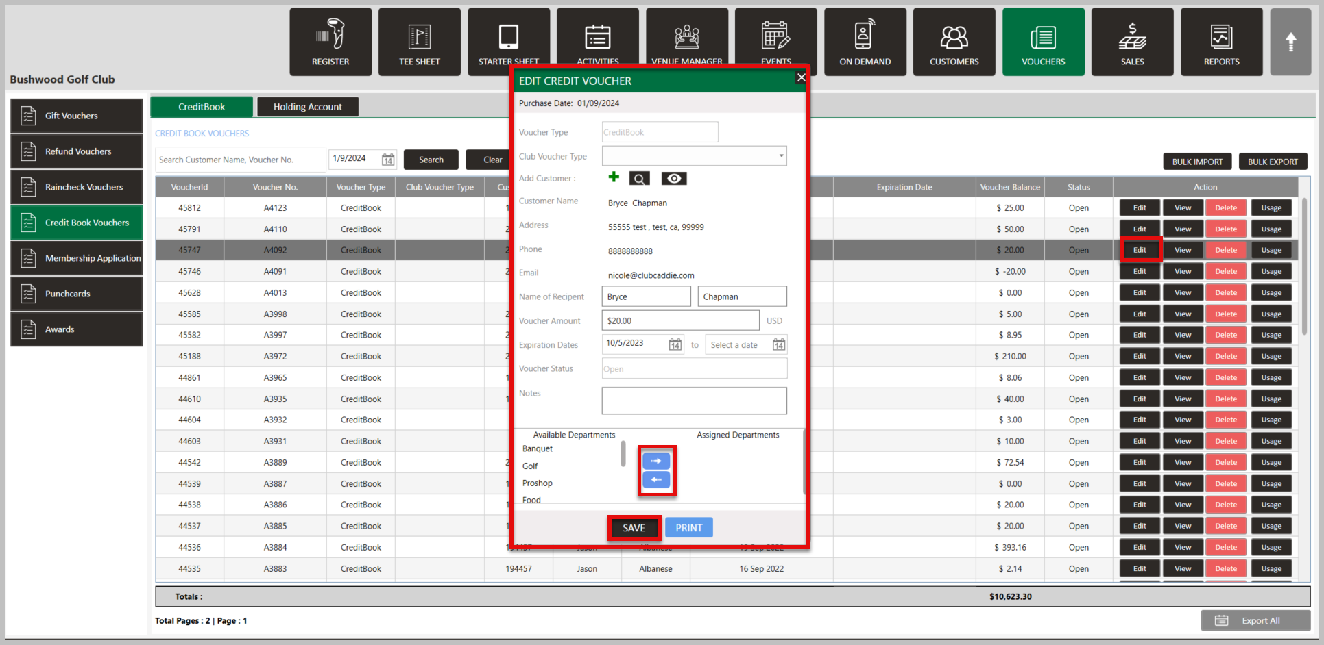 Step 2: Click on Edit for the Voucher that you want to adjust. Then in the Edit Credit Voucher pop up, select which departments you want the voucher restricted to at the bottom by clicking on the arrows. Once you have the departments under Assigned Departments that you want the Voucher valid for, click Save.